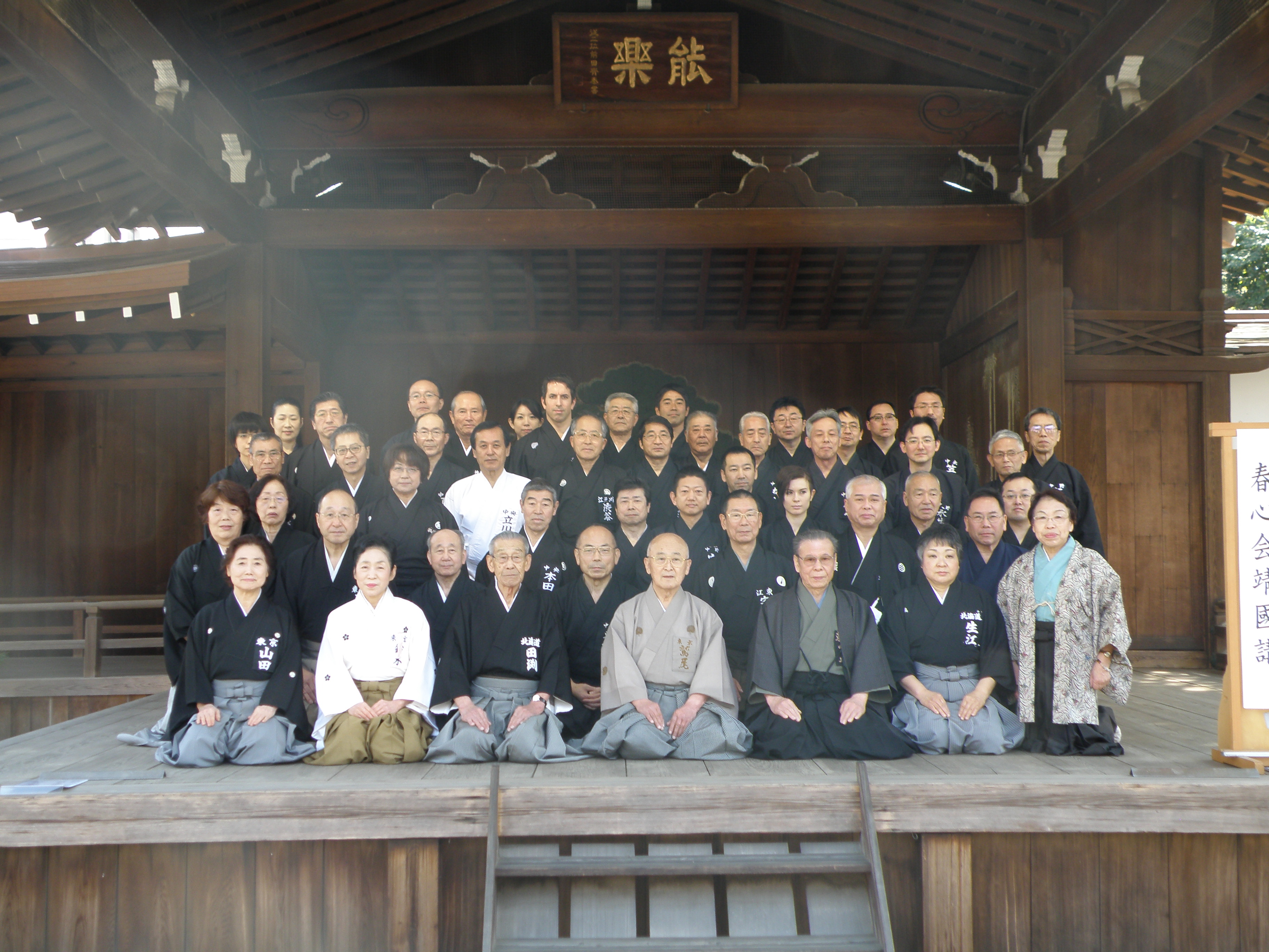 Twenty-four years ago my teacher Washio-sensei founded a yearly exhibition of martial arts called the Shun-Shin-Kai (春心会, or “Heart of Spring Association”), held at the Noh stage of Tokyo’s Yasukuni Shrine, one of the major Shintō shrines in the country. While the shrine itself is the focus of a good deal of controversy (those enshrined there include some convicted of war crimes during the Second World War, which causes a great deal of indignation when high-ranking officials such as the prime minister pay their respects there, especially among the leaderships of other Asian nations that suffered under Japanese rule before and during the war), our Association takes the name of the shrine at face value (“Yasukuni” 靖国 means “peaceful country”), and use the opportunity to both welcome the return of spring and pray for the continued peace of the country.