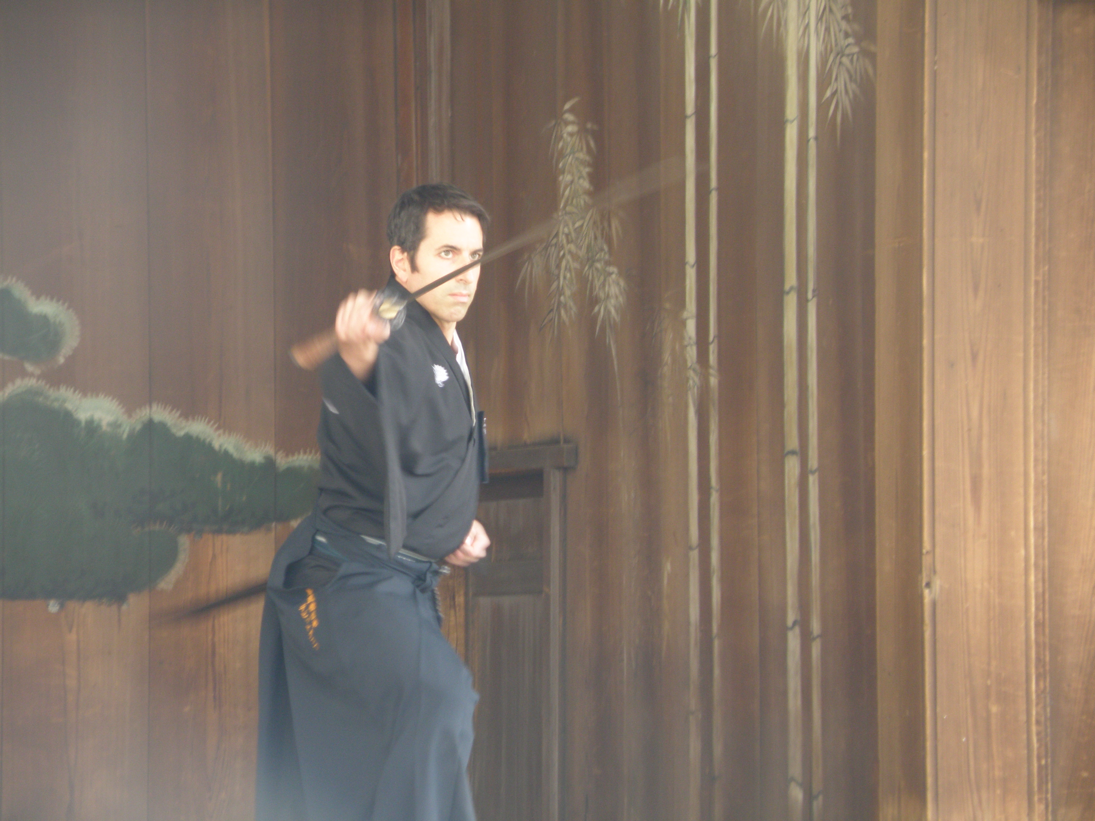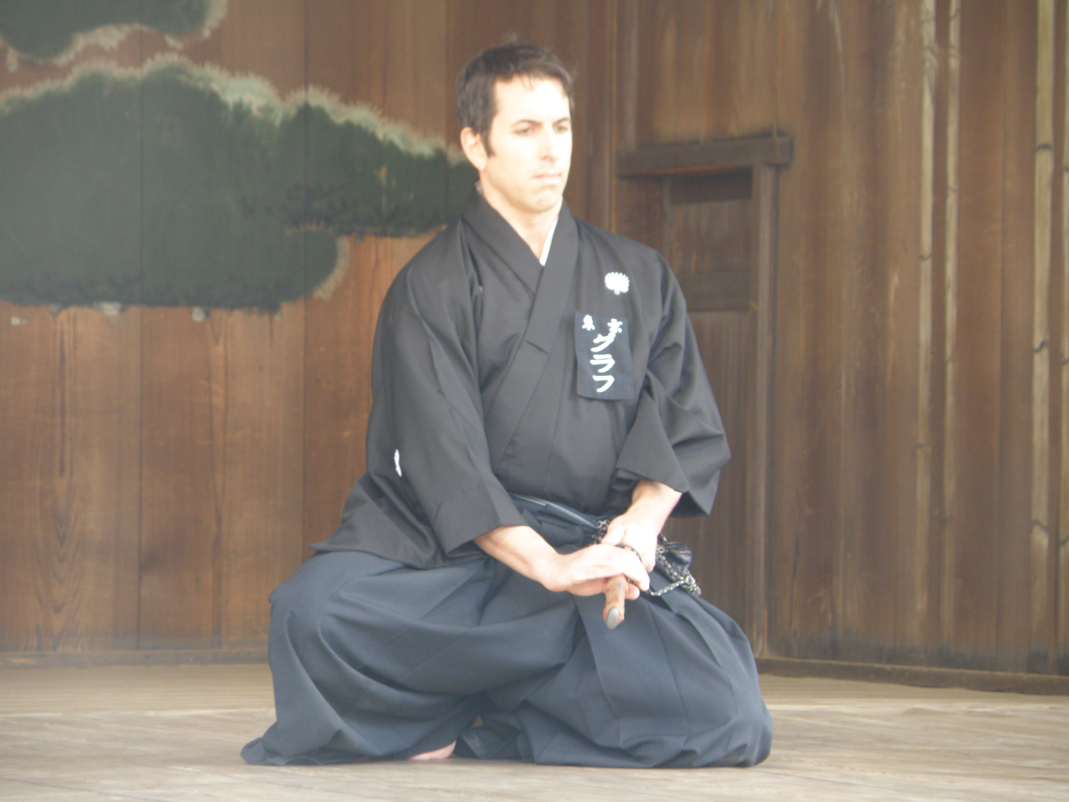 This year’s exhibition was March 17th; we were fortunate in that the weather cooperated, and had mild, indeed spring-like weather, and even a few early sakura (桜: Japanese cherry) blossoms. The atmosphere of the shrine is very conducive to a feeling of gravity and connectedness to tradition, so it is always a deeply compelling experience to participate in the event. This was my first time to perform iai in public wearing the formal montsuki, a kimono top usually bearing the wearer’s family crest, but in my case this time the mon (紋、crest) of our dojo. I also participated in an exhibition of Miyamoto Musashi’s Ni Ten Ichi Ryū style of swordsmanship.